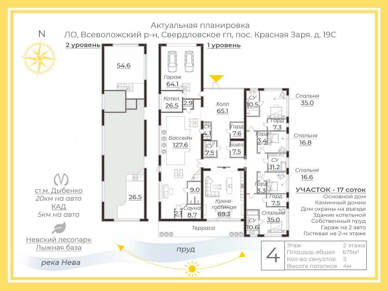 - Гараж рассчитан на два автомобиля, дополнительно имеется дом охраны на въезде и отдельное здание котельной.