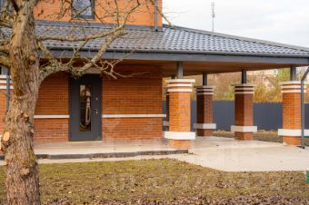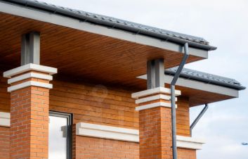 Фасад отделан облицовочным кирпичом, планкеном и декоративными молдингами.