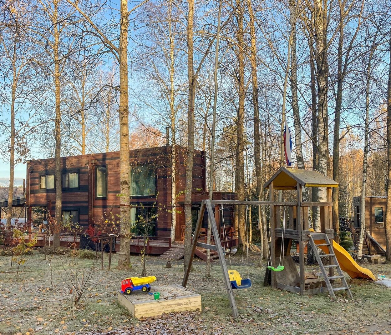 - детская площадка с горкой, качелями и батутом, детский домик с турболётом.