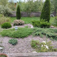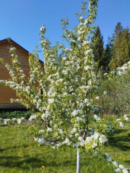 * разнообразные посадки — фруктовый сад и декоративные растения.