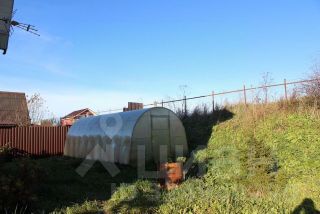 Участок огорожен забором, есть хозблок (металлическая бытовка), беседка, теплица из поликарбоната.