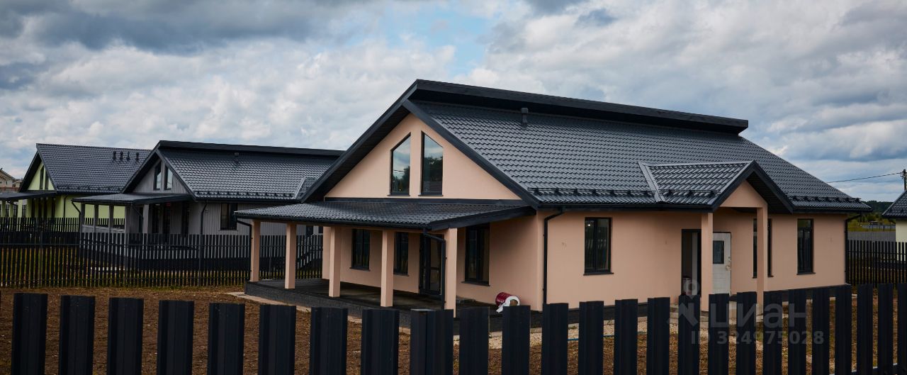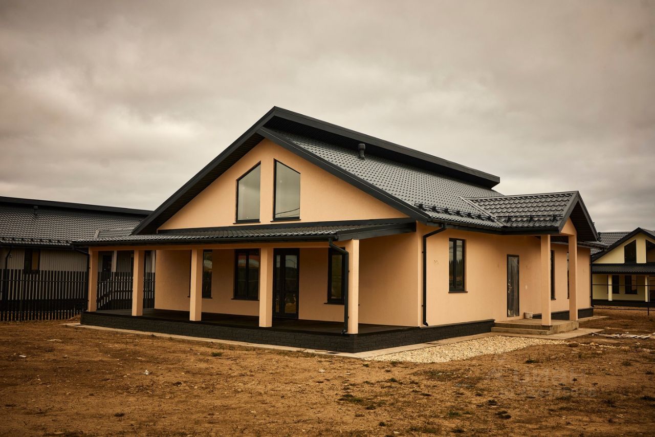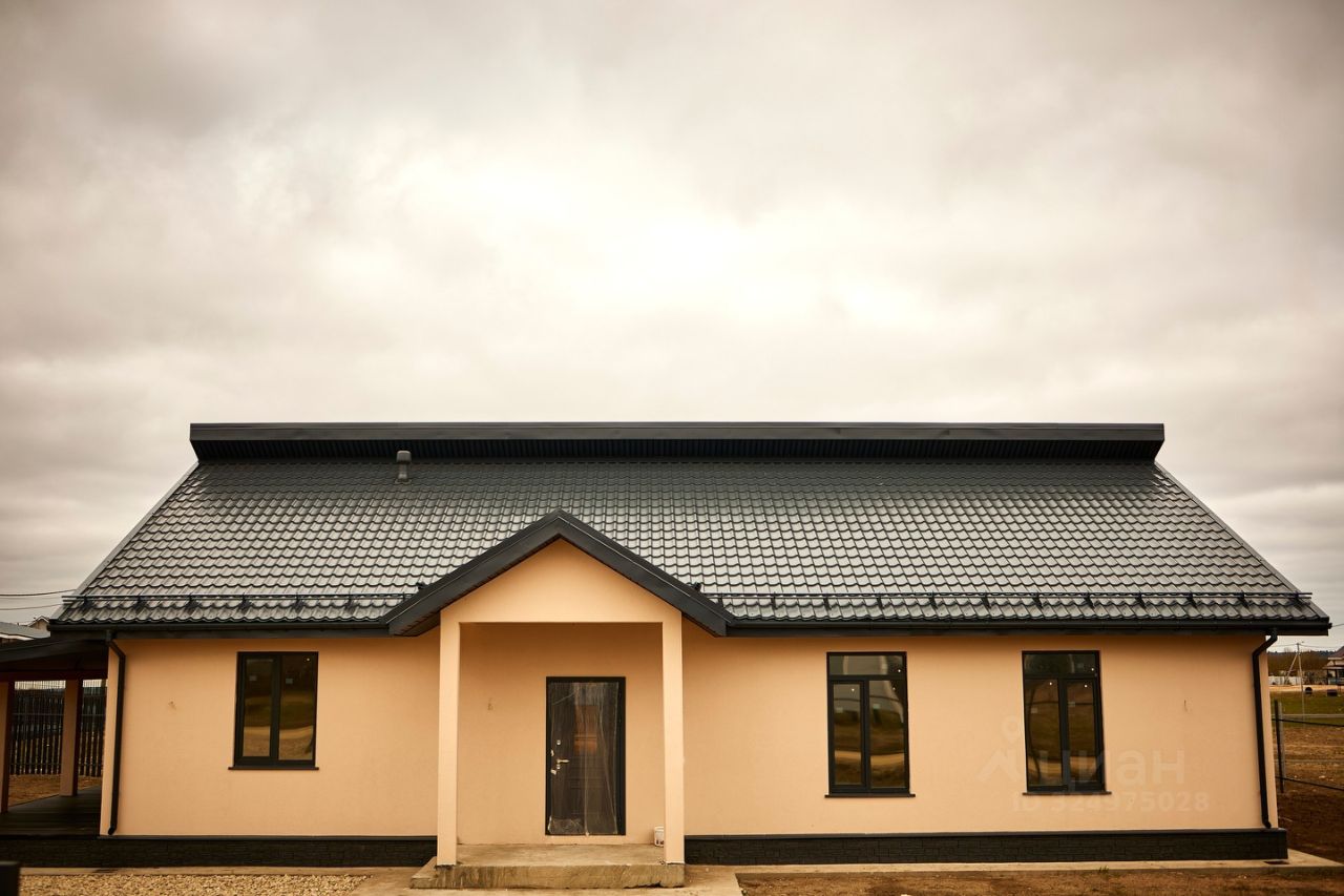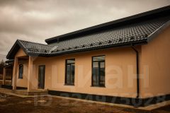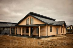 Одноэтажный, новый дом цвета "Капучино", с отделкой, сауной и вторым светом, из газoбетона (газоблоков) для круглогодичного проживания с террасой в коттеджном поселке "Поместье Алексеевское", на участке 12,58 соток в Ломоносовском районе.