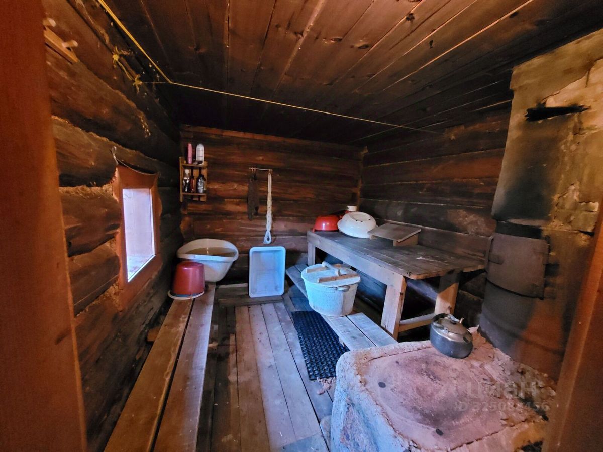БАНЯ из бревна на ленточном фундаменте. Вокруг отсыпан известковый щебень. На чердаке бани есть спальное место.