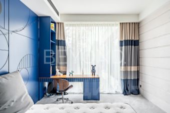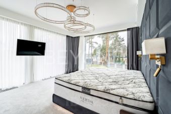 Внутри дома вас поразит изысканный интерьер с использованием натурального шпона американского ореха, микробетона с подогревом и премиального ковролина. Вся мебель выполнена на заказ, а встроенная техника ASKO, Liebherr, OMOIKIRI и DUNAVOX подчеркивает высокий статус этого дома.