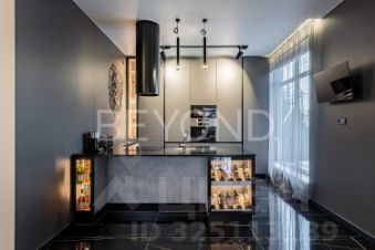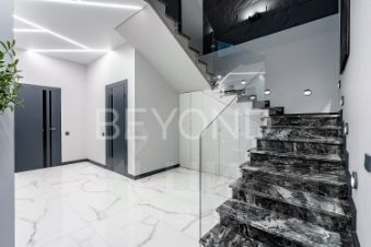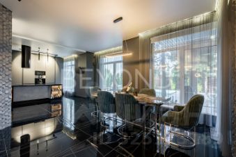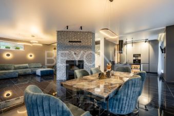 Дом полностью меблирован и готов для постоянного проживания. На первом этаже располагаются: гардеробная при входе, гостевой санузел, единое пространство кухни-гостиной с камином и выходом на террасу. Кухня оборудована современной бытовой техникой, вся мебель изготовлена на заказ.