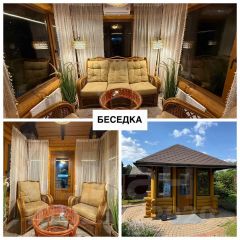 Беседка из бревна с ротанговой панорамной комнатой.