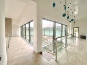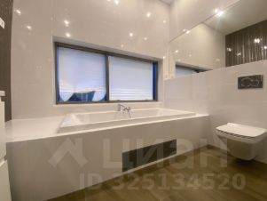 На втором этаже хозяйская спальня так же с видовым остеклением и со своей отдельной электрической сауной, ванной, санузлом и гардеробом. Детская со своим санузлом, ванной и гардеробом. Двухэтажный рабочий кабинет с видовым остеклением и на реку , и на гостиную. И три гостевые спальни, санузел с душевой, еще гардероб и кладовая с люком на первый этаж.
