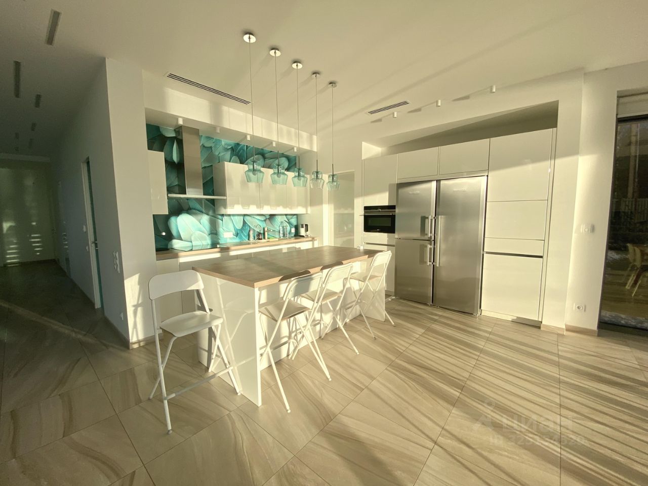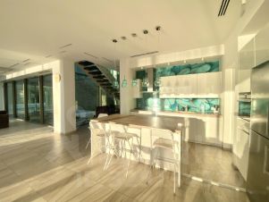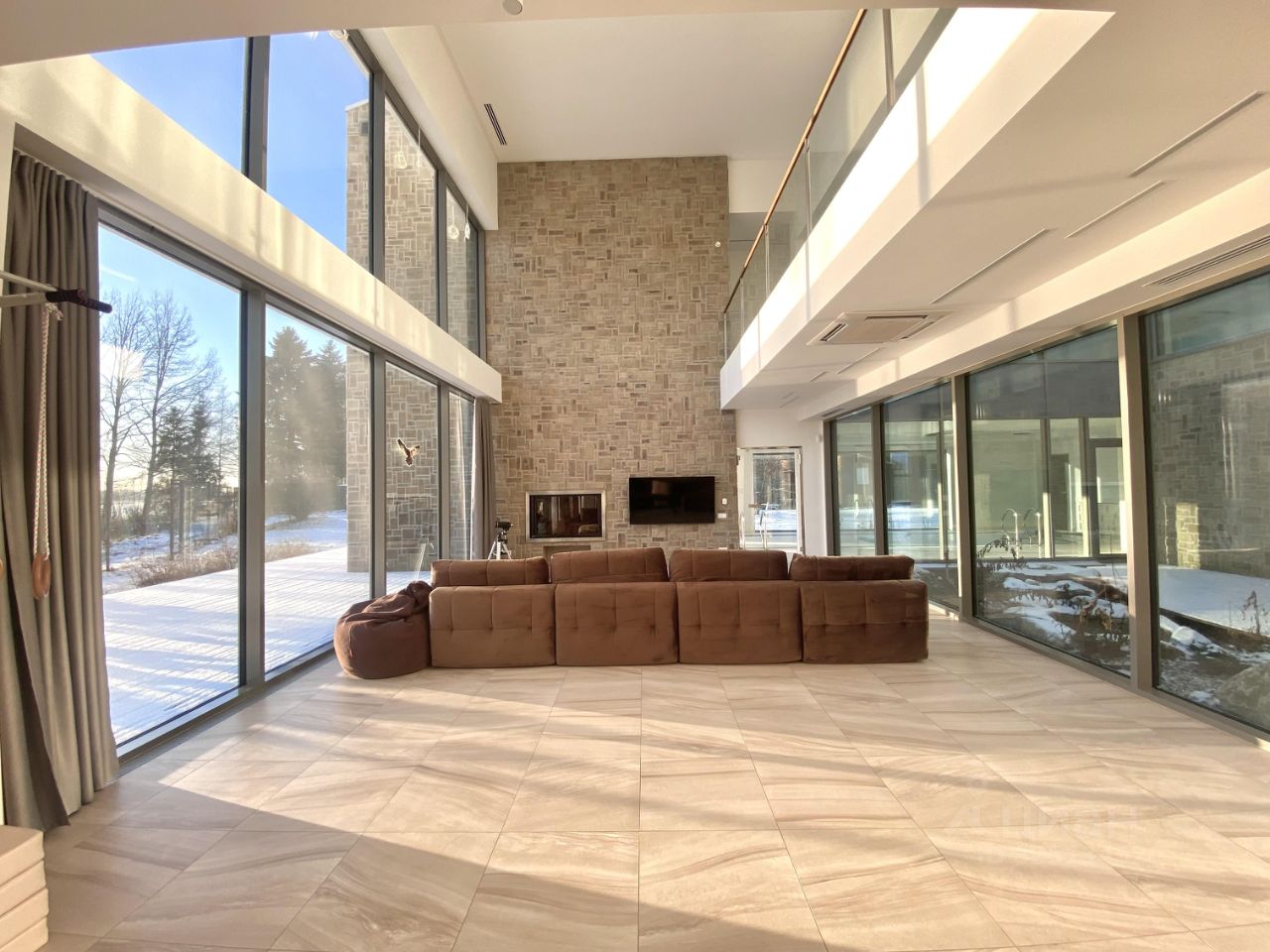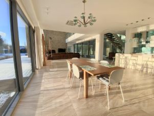 На первом этаже кухня - гостиная с ТВ и с большим камином, остекление и на реку , и во внутренний двор с ручейком и хвойниками, и на бассейн. Помещение под кинотеатр ( но без отделки и оборудования), мастерская со стеллажом и умывальником-раковиной, постирочная с стиральной машиной, ну и крытый отапливаемый гараж на два машиноместа с автоматическими воротами.