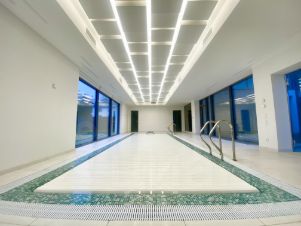 Большая спа-зона построена с 9-и метровым переливным бассейном , в уровень пола, который оборудован профессиональным противотоком рассчитанным на мастера спорта по плаванию.