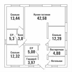 - 3 спальни (13,44 кв.м, 12,30 кв.м, 12,32 кв.м);