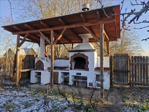 На участке расположены: рубленая баня 6,8х3,5м с верандой 9 кв.м; барбекю-комплекс, состоящий из помпейской печи (пицца, хлеб, готовка в чугунках, противни), плиты под казан, мангала, коптилки горячего копчения и рабочей столешницы с мойкой; бревенчатый сарай 8,7х4,9м.
