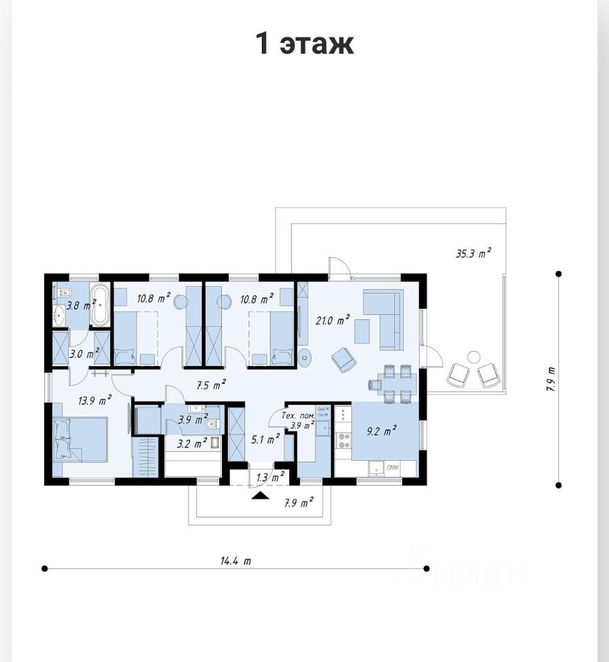 Размер дома 14,4 на 7,9 метра