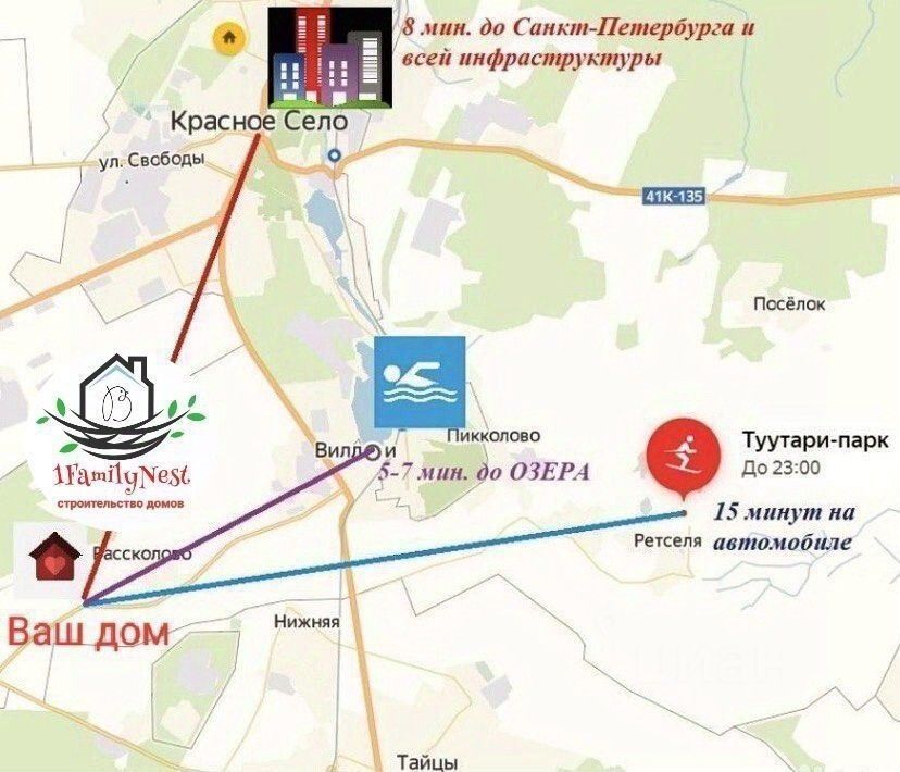 На участке в 6 соток расположен дом. Участок ровный, правильной формы, не нуждается в дополнительных вложениях. Мощность электроснабжения составляет 15 кВт (договор напрямую с Ленэнерго гарантирует отсутствие завышенных тарифов). Имеется собственная скважина с подведенной в дом водой и септик. В посёлке проведено оптоволоконное интернет-соединение. Отличное место для постоянного проживания. Соседи живут постоянно в построенных нами домах (есть возможность осмотреть дома и пообщаться с владельцами). Общественный транспорт (маршрутное такси с прямым сообщением до метро и железнодорожной станции) находится в 600 метрах. В непосредственной близости вся необходимая инфраструктура Красного Села и Виллози: школы, детские сады, поликлиники, банки, магазины, гипермаркеты, спортивные комплексы и многое другое. Благодаря удобному подъезду с двух крупных шоссе, Таллинского и Киевского, Вы сможете легко добраться до дома, минуя пробки. В этом направлении расположены Тайцы, Аропаккузи, Телези, Лаголово.
