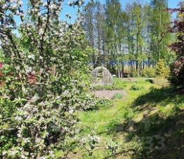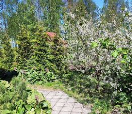 Ухоженная территория участка, беседка, увитая девичьим виноградом. Молодой сад с плодоносящими яблонями, сливой, грушей, вишней, множество плодовых кустарников.