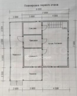 На первом этаже кухня-гостиная , спальня, прихожая и санузел