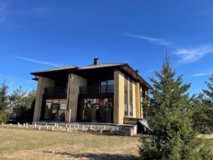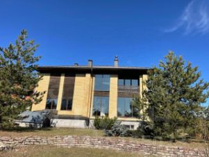 На первом этаже: большая комната-студия (87 м2) с панорамными окнами и выходом на террасу, спальня (22 м2), санузел, гараж (46 м2).