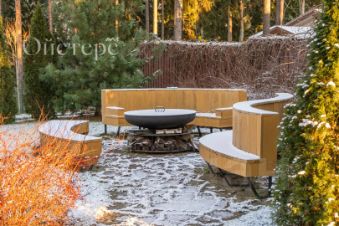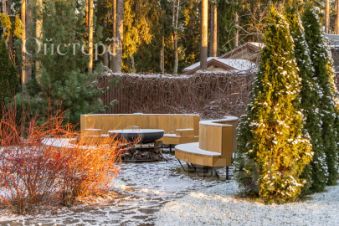 Перед домом обустроена зона для отдыха с открытым очагом, скамьями и качелями — прекрасное место для вечерних посиделок. Отдельный гараж для техники и спортивного инвентаря, а также навес для автомобилей решают вопрос хранения и парковки.