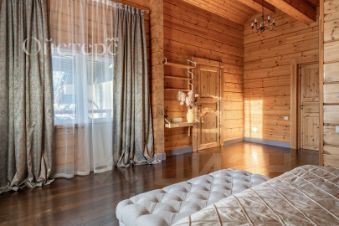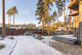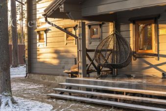 Двухэтажный дом из клеёного бруса, выполнен в скандинавском стиле с использованием европейских материалов. Конструкция рассчитана на долговечность: монолитная железобетонная плита в фундаменте, мягкая черепица с утеплителем 350 мм на кровле. Деревянный забор по всему периметру, откатные ворота с электроприводом и подсветка дома создают ощущение защищённости и комфорта.