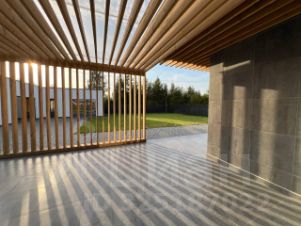 - Внешняя чистовая отделка фасада и зон отдыха: - окраска фасада защитной акриловой фасадной краской - чистовое напольное покрытие на террасе керамогрант, на балконе-террасная доска и стеклянное ограждение.