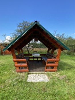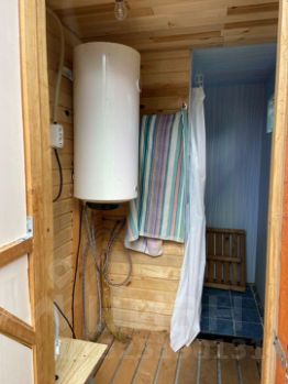 На участке также имеется баня (брус) размером 6х3 м2 с кирпичной печью, снаружи обшита блок-хаусом. Хоз. блок из газобетона размером 3х4 м, его можно использовать в качестве гостевого домика. Участок снабжен центральным водопроводом из скважины (подача воды осуществляется с мая по ноябрь). Туалет с биотуалетом, умывальник под крышей находятся на улице и душевая с горячей водой (элекрический водонагреватель). Беседка размером 2.2 на 2.7 метра., деревянный сарай размером 2х3 метра для садового инвентаря.Все постройки 2012-2022 года! Дом построен в 2019 году. Участок по периметру огорожен сеткой рабицей, ворота для въезда автомобиля. Строили сами, для себя с большой любовью.