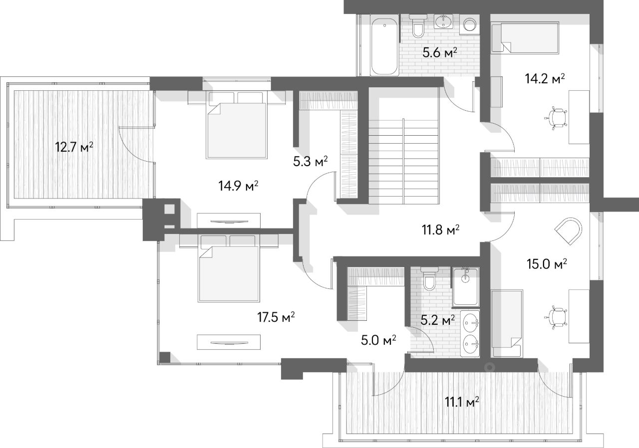 Здесь дом становится по-настоящему семейным: отдельные спальни правильных пропорций, индивидуальные гардеробы и санузлы позволяют каждому члену семьи чувствовать себя комфортно и автономно. Родители получают приватную зону для отдыха, дети — собственное пространство для сна, учёбы и взросления. Террасы второго этажа добавляют дому особую атмосферу — утренний свет, свежий воздух и возможность побыть наедине с собой.