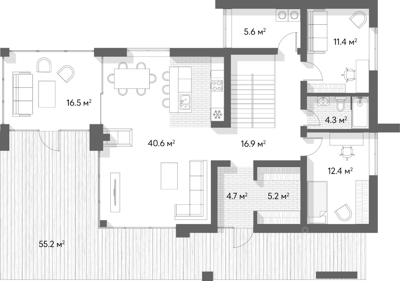 Просторная кухня-гостиная 40,55 м² с выходом на террасу становится естественным центром дома: здесь проходят семейные ужины, праздники, выходные завтраки и спокойные вечера. Пространство позволяет детям быть рядом, не мешая взрослым, а взрослым — оставаться вовлечёнными в семейную жизнь.
