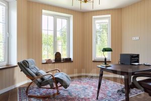 Второй дом — 150 м². Полностью жилой: кухня, гостиная, общее пространство, спортзал, санузел и душевая. На втором этаже — несколько спален. Можно использовать как гостевой дом, для родителей или сделать отдельное пространство под свои задачи.