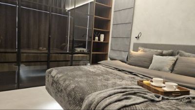 -Кухня- панорамное окно, кварцевая столешница шириной 1 м, встроенная техника и скрытая вытяжка, мебель выполнена из качественных материалов Еggеr, крашенные МДФ-фасады с фрезерованными ручками, с фурнитурой Вlum (пр-во Германия), диван ВОСА NАVI, авторский умный стол из слэба карагача с подсветкой, парящая кровать