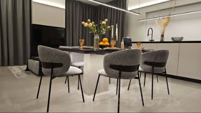 - Внутренняя отделка: потолки высотой 3м, скрытые двери 3м, теневой плинтус, керамогранит на полу, стены с декоративной штукатуркой, потолки монолитные