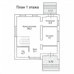 На первом этаже располагаются: просторна кухня-гостиная 28,2 кв. м, гостевая спальня 11 кв. м, санузел 4,7 кв. м, котельная 5,5 кв. м со вторым входом с улицы, холл 9,1 кв. м.