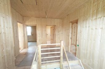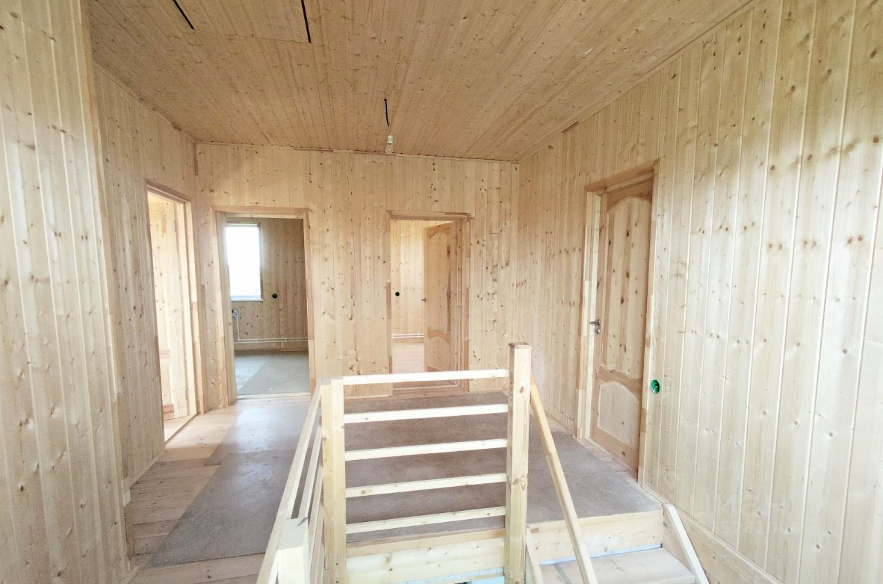 На втором этаже выполнена отделка из натурального дерева под брус в скандинавском стиле.