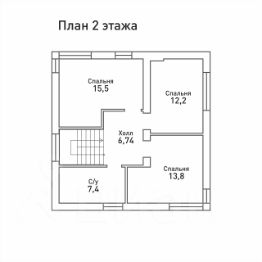 Планировка второго этажа включает в себя: 3 спальни (15,5 кв. м+ 12,2 кв. м+ 13,8 кв. м), санузел 7,4 кв. м и холл с лестницей 6,74 кв. м.