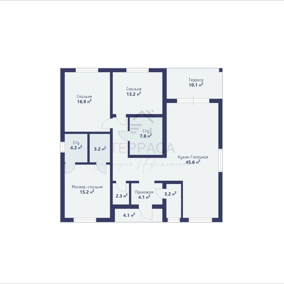 1 этаж - кухня-гостиная с выходом на террасу, 3 изолированные комнаты (одна из них - мастер-спальня с отдельной гардеробной и санузлом), прихожая, санузел, кладовая, котельная.