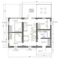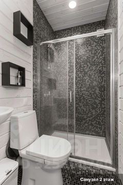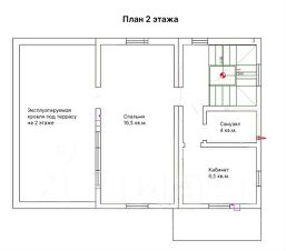 На втором этаже расположены спальня с выходом на эксплуатируемую кровлю- террасу с видом на лес, а так же кабинет и санузел с ванной.