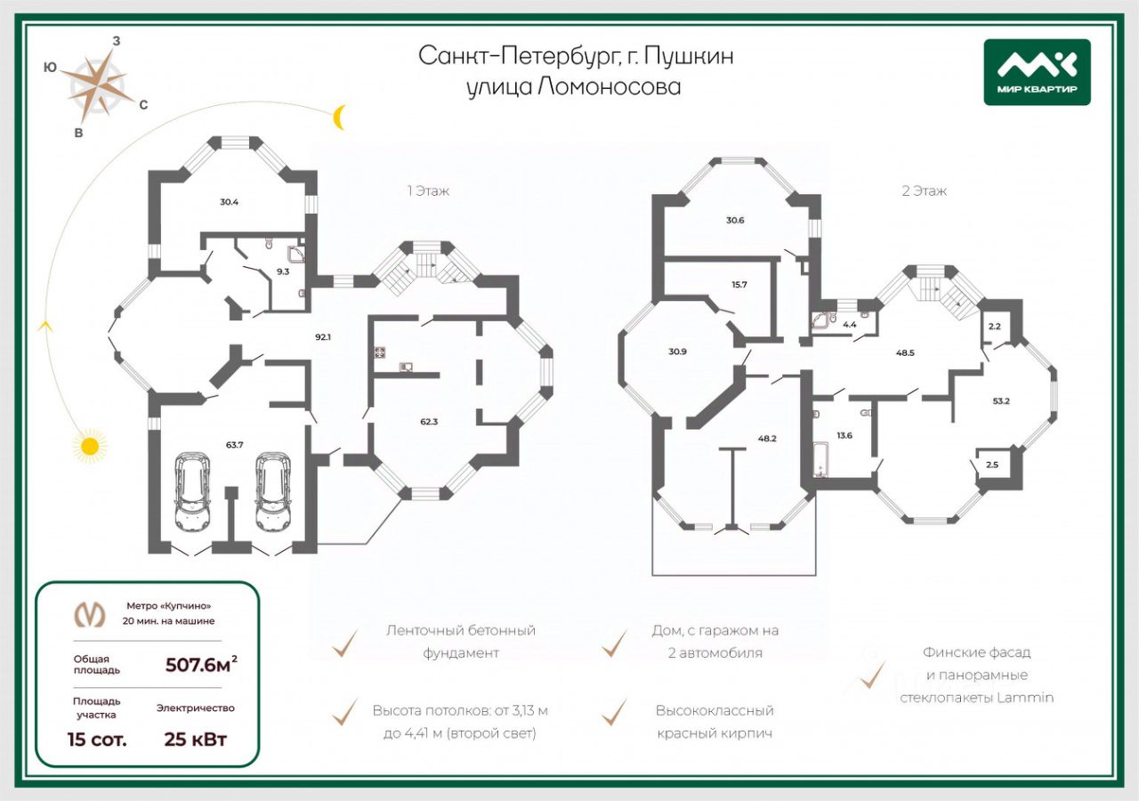 Дом: 508 м² на двух этажах, с гаражом на 2 машиноместа.