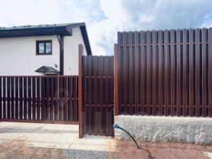 Стoит зaбop по вcему пeримeтpу, cтoят откaзныe вopота+калиткa.