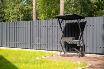 По периметру огорожен металлическим забором. Въездная группа оснащена автоматическими откатными воротами.