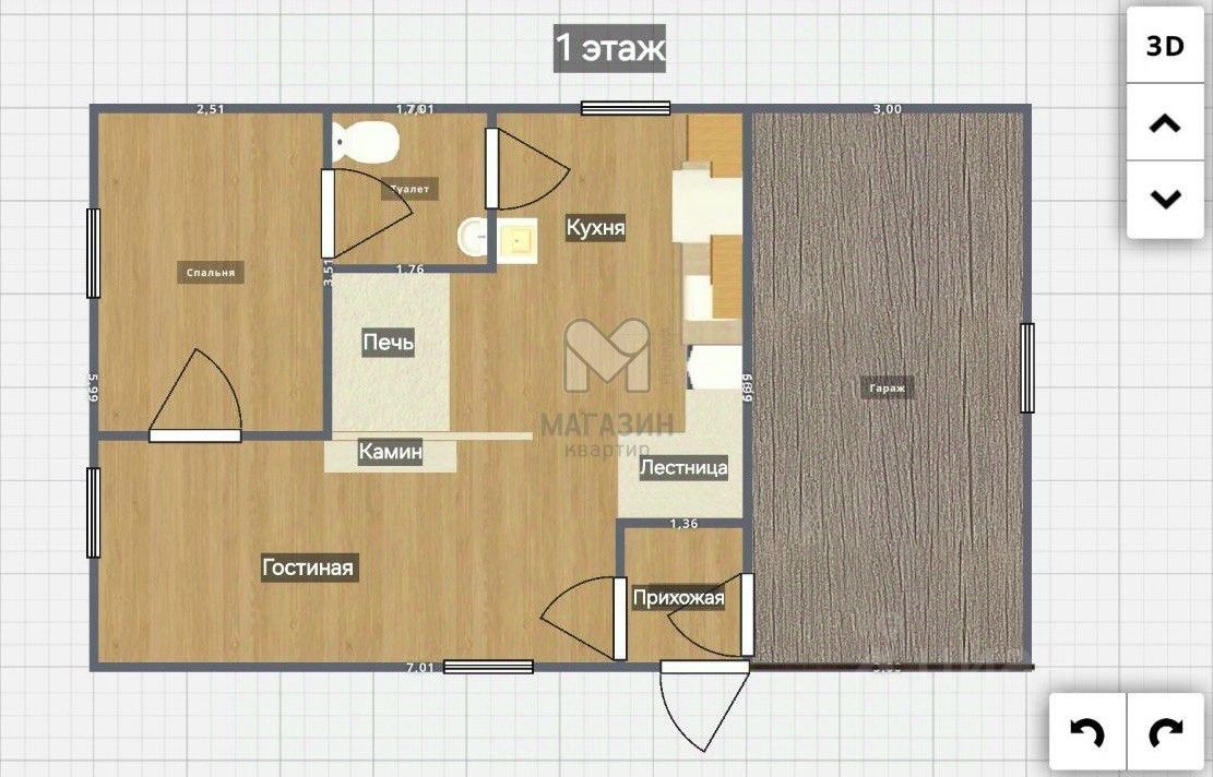 1й этаж: просторная гостиная, кухня, санузел, гараж для автомобиля с входом прямо из дома. Высокие потолки (2,7 м), большие окна, внутренняя отделка вагонкой.