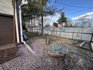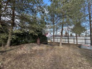 Участок правильной прямоугольной формы, угловой, соседи только с 2-х сторон, огорожен забором с въездными воротами и калиткой. С задней стороны участка растут многолетние ели и сосны, которые одновременно являются живой изгородью от соседей (забор с этой стороны тоже есть).