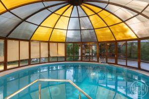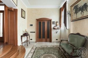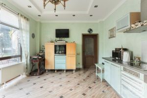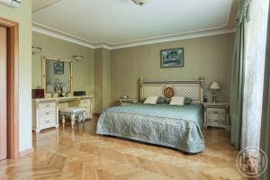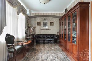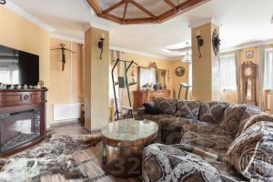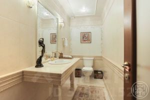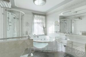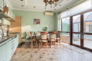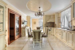 Коттедж 338 кв.м имеет просторную кухню-гостиную с выходом на террасу, кабинет и 3 спальные комнаты, спортивный зал, оборудованный мансардный этаж со своим с/у. Несколько гардеробных комнат и подсобных помещений.
