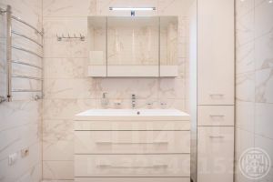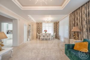 Первый этаж представительский - кухня, столовая - гостиная с выходом на террасу и сад. Также на первом этаже расположены с/у, холл, гардеробная, 2 кладовые и техническое помещение (котельная). На первом этаже теплый водяной пол.