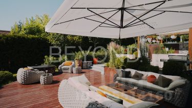 Летняя кухня, зона BBQ и уличная обеденная зона под технологичной двухзонной перголой. Системы "умный дом", климат-контроль, видеонаблюдение.