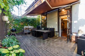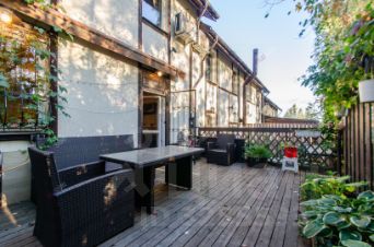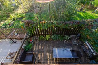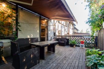 Задний двор с выходом в зелёную зону. Терраса оборудована автоматической маркизой, грилями Weber (электро и угольный), садовой мебелью. Пол — долговечная террасная доска.