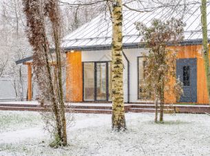 Главная особенность дома - ощущение свободы и света, этому способствуют высокие потолки и панорамные окна, стирающие границы между интерьером и природой.