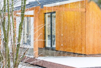 Отделка фасада штукатуркой и декоративным планкеном.