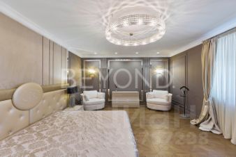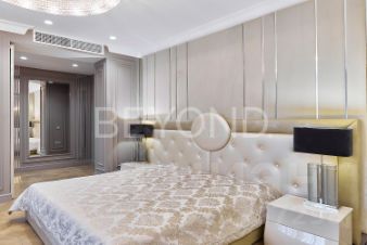 Мастер-спальня с огромной кроватью от Fendi, брутальные лампы и мебель от Eichholtz. Стены спальни обшиты тактильно приятным текстилем. Мастер-гардеробная комната изыскана, функциональна и вместительна.
