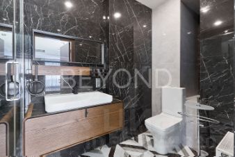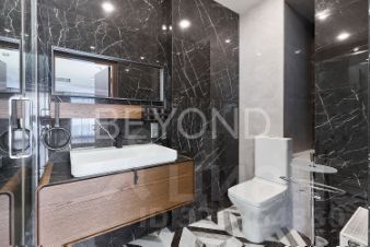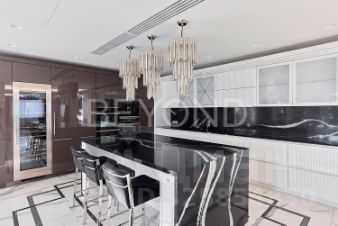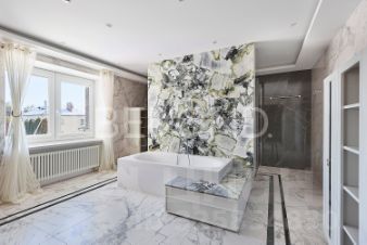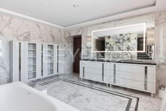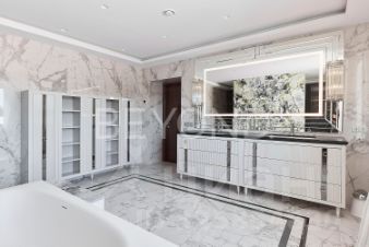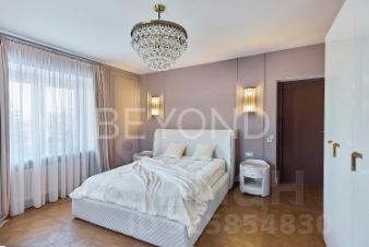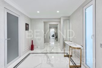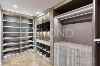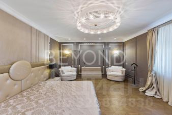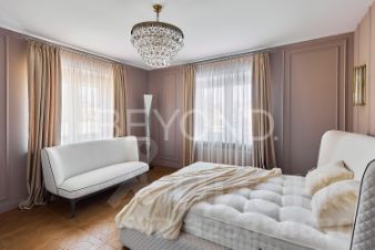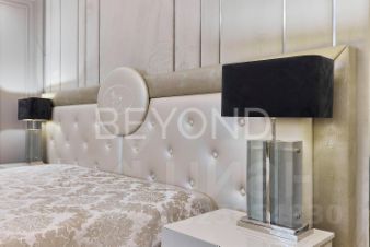 Мастер-спальня с огромной кроватью от Fendi, брутальные лампы и мебель от Eichholtz. Стены спальни обшиты тактильно приятным текстилем. Мастер-гардеробная комната изыскана, функциональна и вместительна.