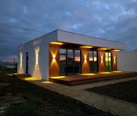 - Фасад: декоративная штукатурка и деревянный планкен с вентиляционным зазором.