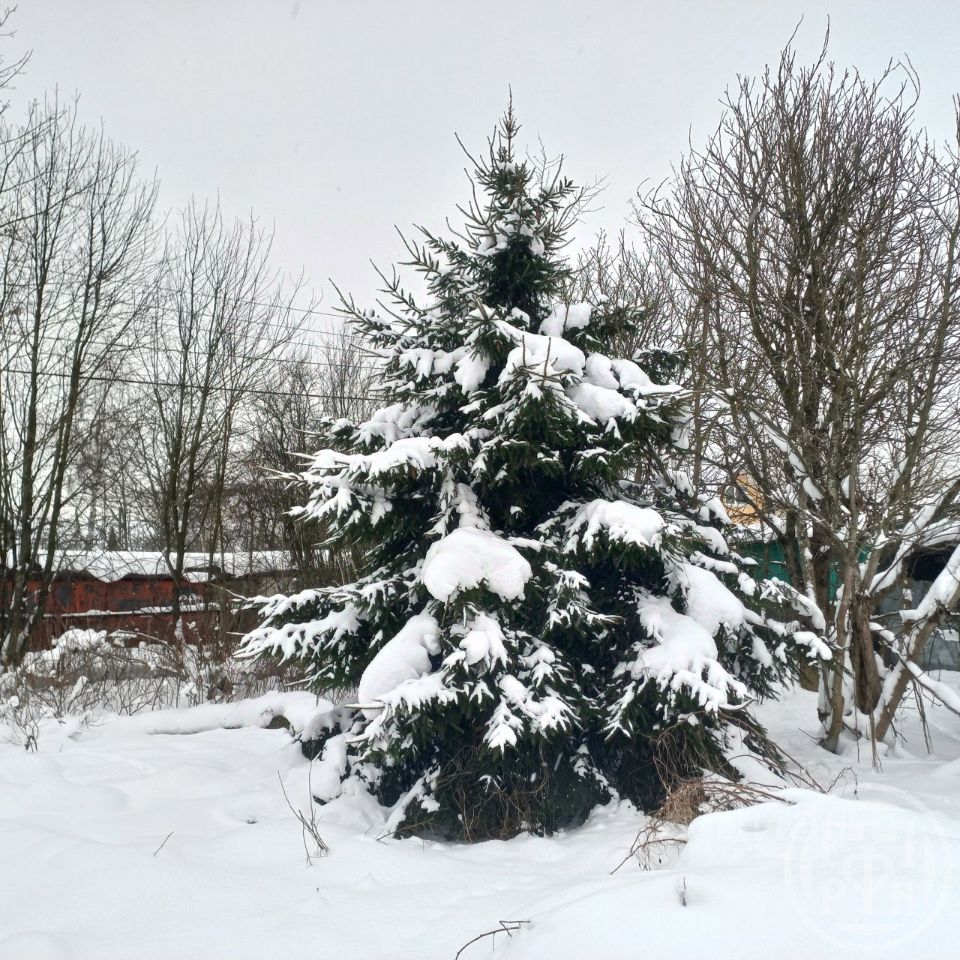 Участок ровный правильной формы, есть ворота, залит фундамент под гараж или навес для машин. На участке растут плодовые деревья, кустарники и новогодняя ель, которую можно украсить на зимние праздники.