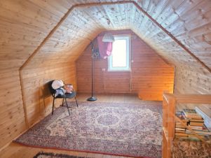 ДОМ-БАНЯ 58 кв.м( 6х6), 2014 года постройки из бруса( брус 100х100), стоит на фундаменте ж/б сваи, под металлочерепичной крышей. Внутри утеплена и обшита вагонкой. На первом этаже: с улицы - пристроенная терраса для отдыха, прихожая, гостевая зона отдыха, сауна, душевая комната( здесь на стене установлена деревянная емкость( обливное ведро) для облива водой после парилки). Вода заведена из водопровода. На втором( мансардном) этаже одна просторная и светлая гостевая комната.